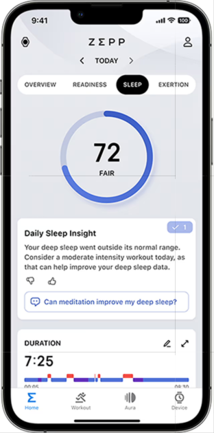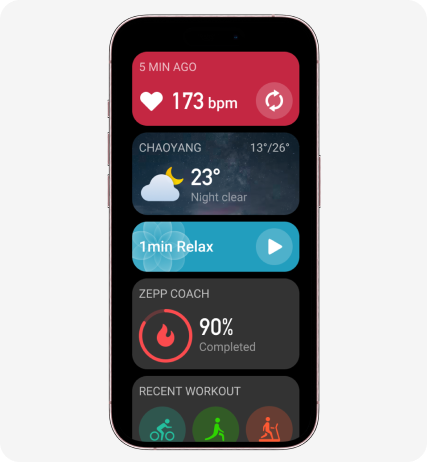 Log into the Zepp App to check detailed health and exercise data, access the watch face and mini app stores, connect to your fitness app accounts, perform firmware updates for your watch, and more.