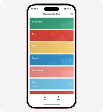 4. Due to the device's storage limit, only a maximum of 20 membership cards can be added to the same account. Supported codes include Code 128, Code 39, UPC A, EAN 13, EAN 8 and QR codes.