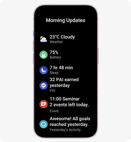 To help you start the day the right way, the watch can provide a clear summary of information³ when you wake up. You can even customize which content is included in your update. -